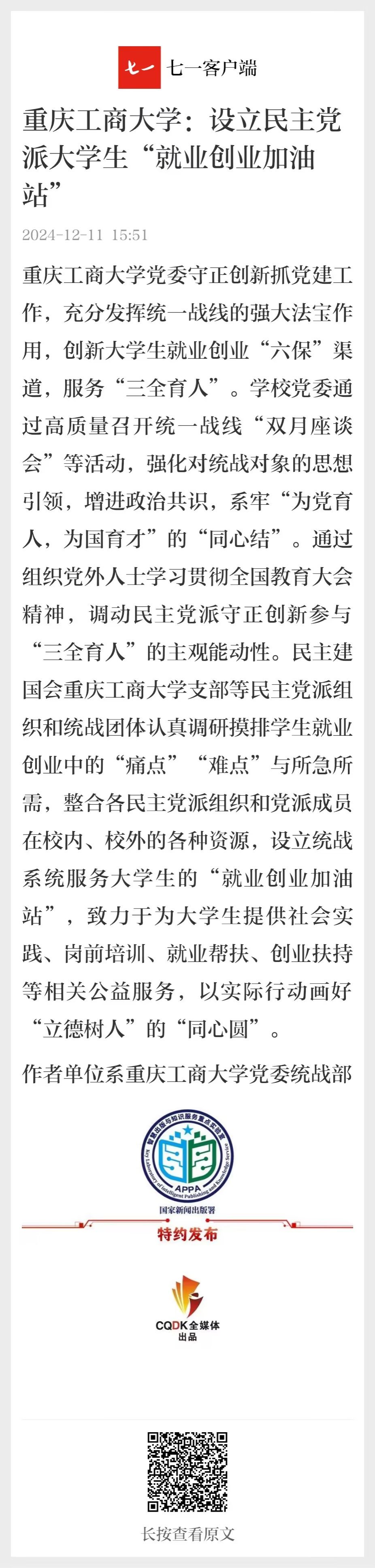 七一客户端报道我校设立民主党派大学生“就业创业加油站”