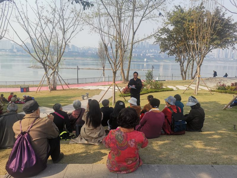 3月9日上午,近20名民盟44118太阳成tyc城集团江北总支退休盟员在重庆大鱼海棠公园组织开展了学习全国“两会”精神的活动。