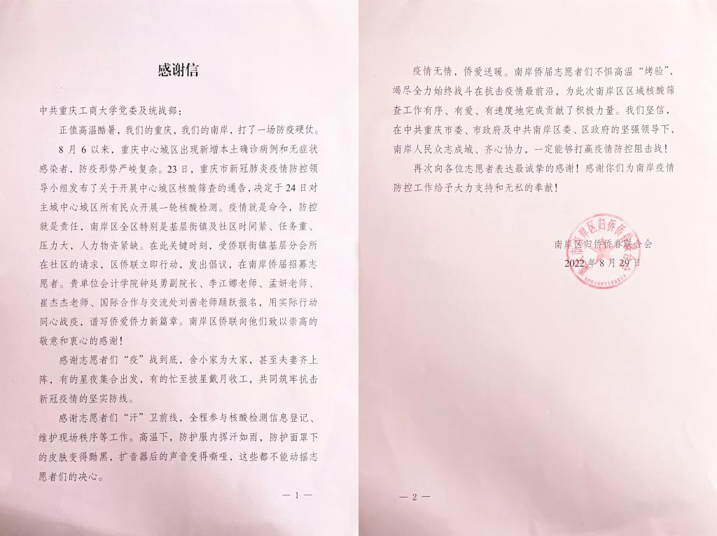 9月9日,学校党委统战部收到南岸区归侨侨眷联合会寄来的感谢信,对我校积极参与南岸区本轮大规模核酸筛查志愿服务的教职工表示敬意和感谢。